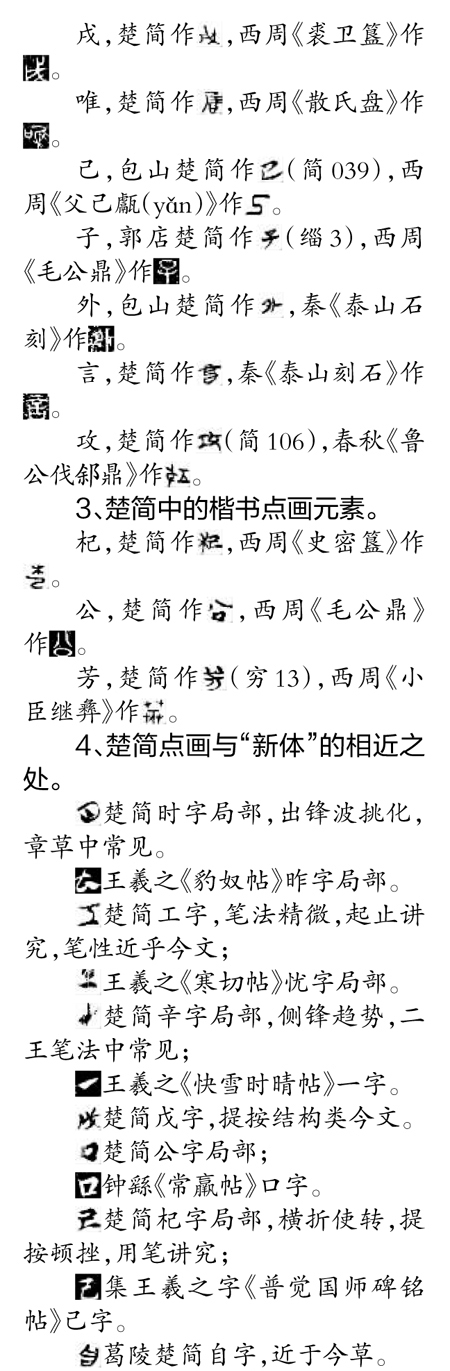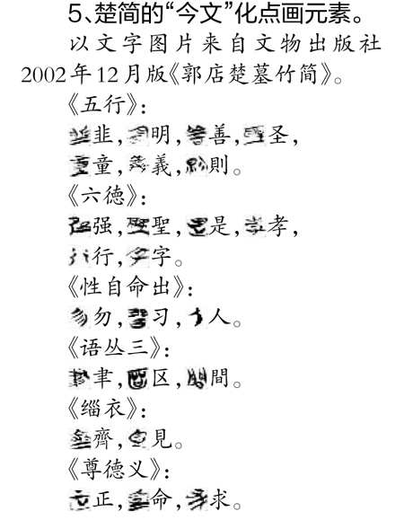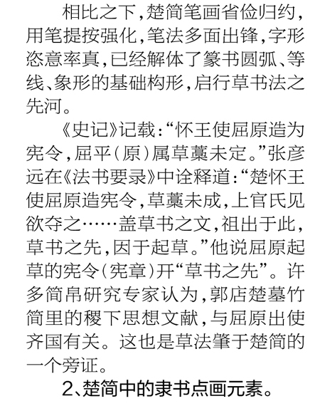 关于楚简文字,郭沫若先生认为:“体式简略,形态扁平,接近于后代的隶书。”裘锡圭先生也认为:“如果秦没有统一全国,六国文字的俗体迟早也会演变成类似隶书的新字体的。”饶宗颐先生也有相同的观点。思想经典的抄写,启迪了书写者的自由意志和人性发微,产生了多样的笔法、墨法、章法形态,具备了后来草、隶、行、楷多种字体的笔法和结构。