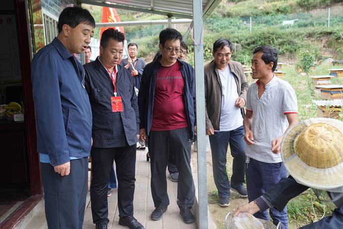 采访团在池沟村合作社观看当地村民酿蜜过程