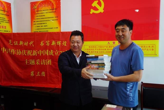 座谈会结束后,邱华栋向池沟村捐赠采访团成员创作和签名的作品。同时,采访团作家在采访团旗帜上郑重签名留念。