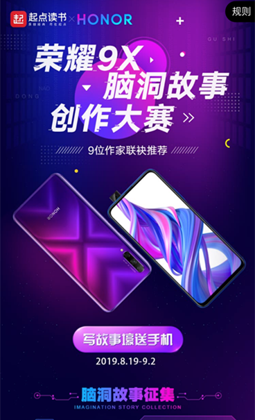 近日,阅文集团旗下原创文学品牌起点中文网与荣耀手机联合打造“脑洞故事创作大赛”,展开为期15天的创意征文活动。活动期间,用户可在起点读书App发现页的活动栏里找到“脑洞故事创作大赛”,点击活动页面中的“去创作”按钮加入圈子进行创意制作。优秀作品除了荣获“故事王”称号之外,还能获得荣耀9X手机作为活动奖励,截至目前参与用户数已超万人。