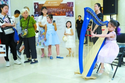 闭幕演出当晚,演出尚未开始,音乐堂大厅就已成为欢乐的海洋。大厅一侧的体验区中,前来观看演出的小朋友们正在为艺术节的主题手绘图填色;另一侧还有几位小琴童,先后带着琵琶、胡琴和竖琴演奏,吸引不少家长和小朋友驻足欣赏。