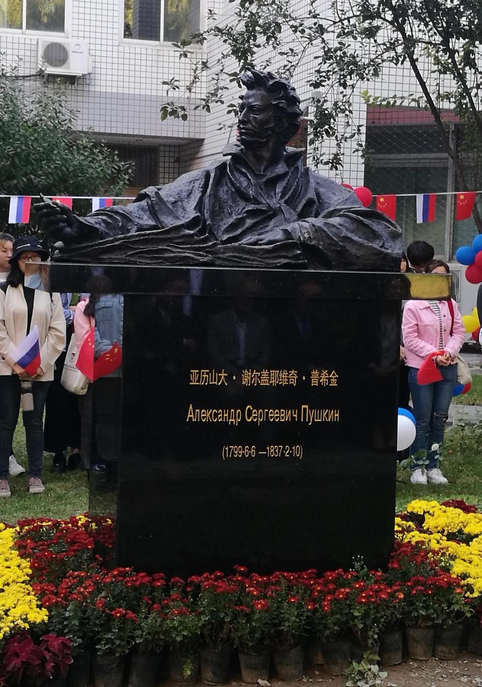 为庆祝中华人民共和国成立70周年、中俄建交70周年、普希金诞辰220周年及首都师范大学建校65周年,10月8日,首都师范大学外语学院、普希金之家北京分部主办了普希金雕像揭幕仪式,仪式在首都师范大学外语学院秋意盎然的花园中举行。