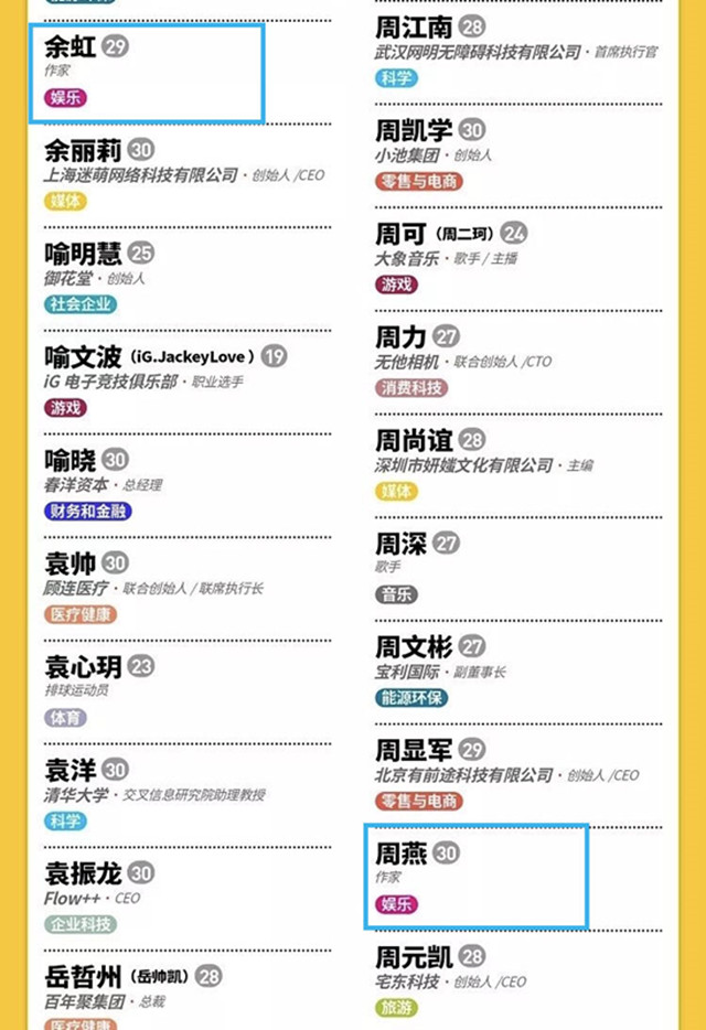 10月17日,福布斯中国公布了最新的30岁以下精英榜(30 Under 30),选出了600位30岁以下活跃在中国的创业和行业创新者。今年的青年精英有来自体育行业的女排主力袁心玥、马术运动员华天,娱乐领域的陈飞宇、春夏等,以及众多青年科学家和商业开创者。令人惊喜的是,网络文学领域中也首次有两位作家荣登精英榜,分别为阅文集团旗下白金作家余虹(笔名乱)和周燕(笔名囧囧有妖)。