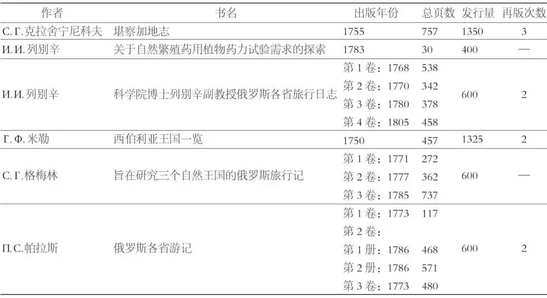 1724年,彼得一世提倡创建了圣彼得堡科学院。根据彼得大帝的意图,科学院不仅仅要“生产”科学,也要将其“传播”,在这些“科学”当中包括自然科学(我们主要指环境科学)。在政府的资金支持下,俄罗斯学者们进行了大量的田野调查,对具有生态学特色的俄罗斯植物群和动物群进行了描写、研究和系统化。田野调查的成果便是科学院教授们的诸多学术著作,如С.П.克拉舍宁尼科夫(С.П.Крашенинников)的《堪察加地志》、И.И.列别辛(И.И.Лепехин)的《科学院博士列别辛副教授俄罗斯国家各省旅行日志》和《关于自然繁殖药用植物药力试验需求的探索》、П.С.帕拉斯(П.С.Паллас)的《 俄罗斯各省游记》、Г.Ф.米勒(Г.Ф.Миллер)的《西伯利亚王国一览》以及医学博士С.Г.格梅林(С.Г.Гмелин)《旨在研究三个自然王国的俄罗斯旅行记》,这些成果均在圣彼得堡科学院印刷厂印刷出版。表4 为18世纪俄罗斯学者在科学院印刷厂出版的学术著作相关数据。