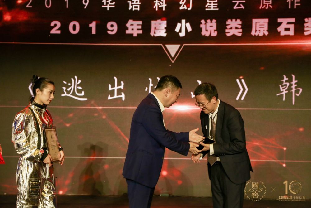 这是第十届全球华语科幻星云奖颁奖典礼。董仁威是全球华语科幻星云奖的主要创始人之一。“星云奖能举办到第十届,本身就是一个奇迹般的科幻故事。”董仁威感慨道。