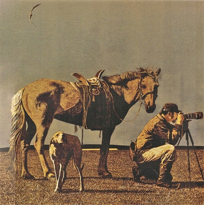 胡日查的套色凸版作品《听见草原——聚焦》不但为自己涂抹了生命的底色,也开阔了表现的视野。站立的马,蹲坐的人,嚎叫的狗,盘旋的鹰,构成了草原悠远的意境。从马的回首到狗的昂头,再到人的远眺,作者巧妙地将视觉焦点转移至相机的长焦镜头上。画面凝聚了主题,视觉引发着听觉,浓缩的景象释放出想象,让观者在虚实间徜徉慢步,让意图在想象中合成。一列飞驰的机车横贯大地,正欲破图而出,所谓“听见草原”即源于此。大地的离离菒草被覆着阳光的暖意,草原的丰富中又添加了机车的鸣响,视觉与听觉在叙说着时代的变化,韩愈的诗句“鸣笛急吹争落日,清歌缓送款行人”正是对应了画面的意境。