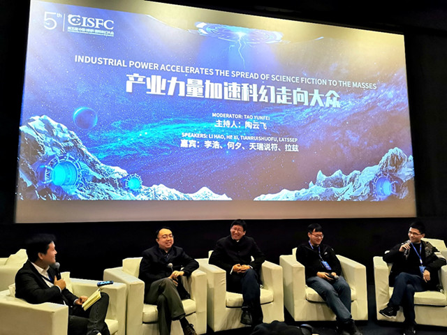 产业力量推动科幻文学走向大众”分论坛现场 (左至右:阅文集团出版内容部总监 陶云飞、知名科幻作家 何夕、科幻世界杂志社副总编辑 拉兹、阅文集团科幻频道资深编辑 李浩、阅文集团旗下作家 天瑞说符)