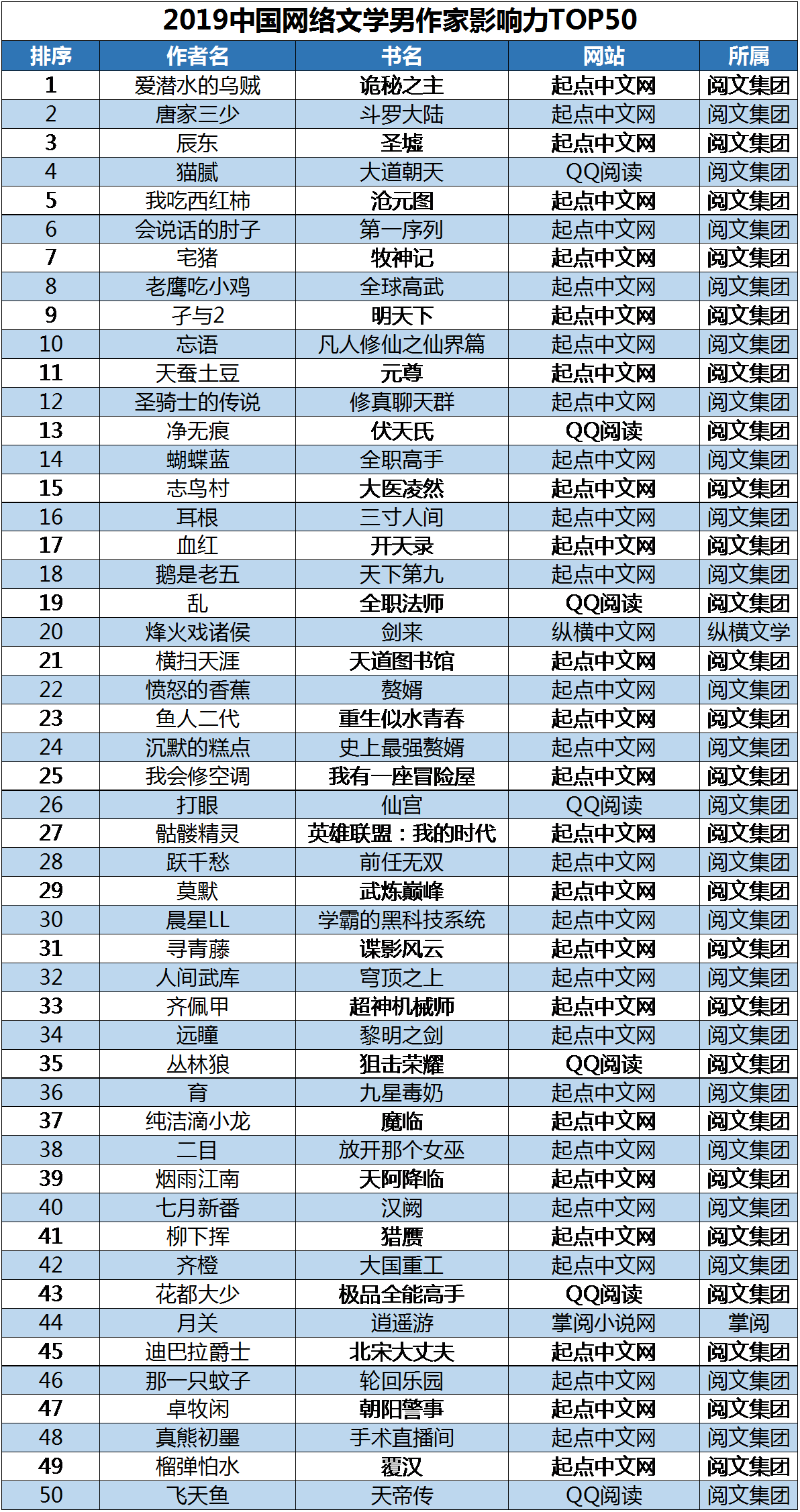 2019年中国网络作家影响力榜男作家TOP50及女作家TOP50