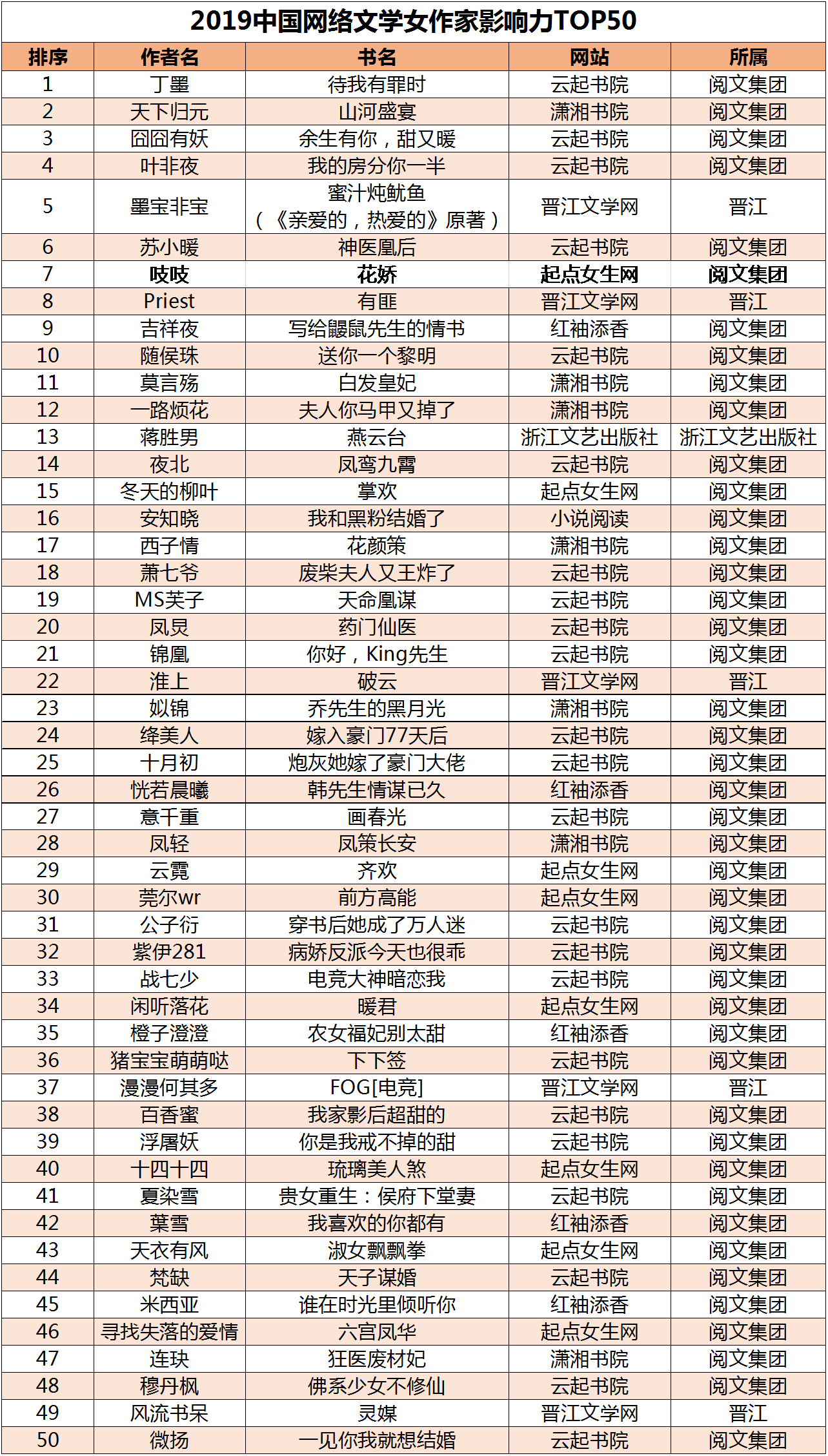 1月7日,权威数据研究与分析机构——速途研究院发布《2019年中国网络作家影响力榜》,通过对作家的作品影响力、平台影响力及新媒体影响力多维度的分析与论证,综合衡量出作家影响力,最终评选出国内最具影响力男作家TOP50及女作家TOP50。