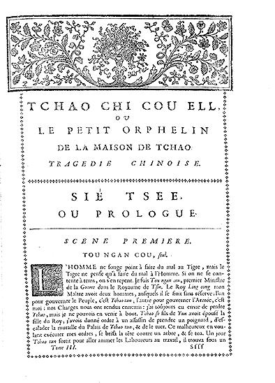 大文豪伏尔泰(Voltaire,1694-1778)在他根据《赵氏孤儿》改编而成的《中国孤儿》(L’O rphelin de la Chine)的《献词》(Epitre)中这样评价这篇译文:“《赵氏孤儿》是一部珍贵的大作,它使人了解中国精神,胜过人们已经做过的以及将来要做的关于这个大帝国所有之陈述。”在18世纪“启蒙运动”的时代,《赵氏孤儿》在西方首次彰显了中国人与黑暗势力坚决斗争,为正义事业前仆后继的英勇形象,第一次在海外奏出了中国人的强音。