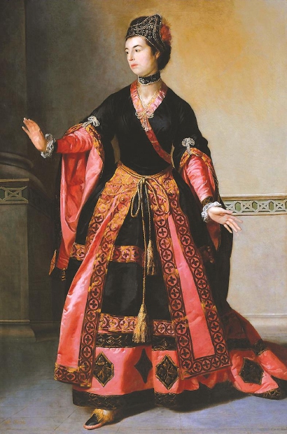 爱尔兰剧作家阿瑟·墨菲(Arthur Murphy)被马若瑟翻译的《赵氏孤儿》所吸引,参考伏尔泰的《中国孤儿》,创作了他的戏剧作品《中国孤儿》,图为剧中勇敢的女性曼丹(Mandane)戏剧舞台造型,由玛丽安·叶慈太太(Mary Ann Yates)扮演