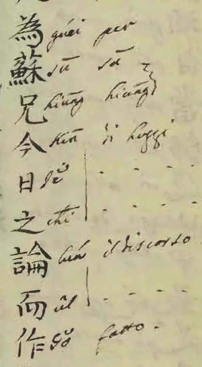 作者帮助读者识字的意图十分明显。试举几例:中文“太常”“副使”等官职,作者在注音后均译为“官员”(mandarino)。“甲科太常正卿”被译为“官衔”(nome di mandarinano)。“人家”译作“人”(huomino)和“家”(case)。为帮助不通意大利文的读者有真切的感受,请允许我把这两个意大利文名词转译英文,前者是human,后者是house。human加house是汉语“人家”的意思吗?还有更可乐的,“尚未联姻”中的“尚未”被译作“上面”(supra)和“不”(non)。常老师说:“万济国的语言能力令人叹服,他不但能够熟练使用汉语,而且还用西班牙语编写了汉语教材《华语官话语法》”,这样一位能人绝不可能不懂“人家”和“尚未”这两个词的含义,之所以逐字注解,他的用意显然是帮助读者识字,而不是请他们读小说。最后再举一个堪称较好的完整句子“为苏兄今日之论而作”,译文是:per(为)Su(苏)兄(hiung)今 日(di hoggi)论(il discorso)作(fatto)。这里的意大利文根本不是一个句子,连猜带蒙固然还能猜出一点意思来。然而,这种文字能说是在翻译一篇小说吗?况且,《玉娇梨》共有二十回,而见诸此件的仅有两千余字,不足一回,相差太大。