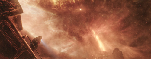 技术方面,因“地木相撞”而引发的诸如地震、冰原崩塌、岩浆渗入等灾难,更容易以电影特效的形式呈现,也更能体现中国电影的技术水准。例如,废弃的城市地标建筑在广袤冰原上的崩塌,让观众叹为观止,惊呼中国电影特效技术的进步。除此,视觉呈现也可圈可点。地下城的展现布景考究、装饰精致。昏暗而混乱的地下黑市,彰显了危机下人类生存环境的窘迫——科技虽然十分发达,但生存环境反而倒退了。前半段,冰原崩塌时,大片的雪白色场景渲染了末日的凄惨和悲情氛围;后半段,“地木”即将相撞时,改造发动机过程中出现的暗黄色与木星爆炸时的暗红色呈现得十分逼真,仿佛在衬托人类文明的顽强。人类的团结,可以在一片冰霜中点出希望的火种。遗憾的是,最后一场戏中的交叉剪辑并没有营造出“最后一分钟营救”的紧张感,反而弱化了情节的重点。