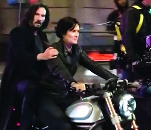 近日,该片正在美国旧金山拍摄动作戏,有网友拍到的几段现场拍摄视频曝光。当中凯莉扮演的崔妮蒂依然穿着经典的黑色皮革连身衣,骑着重机车在路上狂飙,基努·里维斯扮演的尼奥则坐在她身后。另一个片段是两名演员在高空吊威亚演绎动作戏,看起来像崔妮蒂和尼奥的两人,从大楼楼顶飞下来,场面相当惊险。