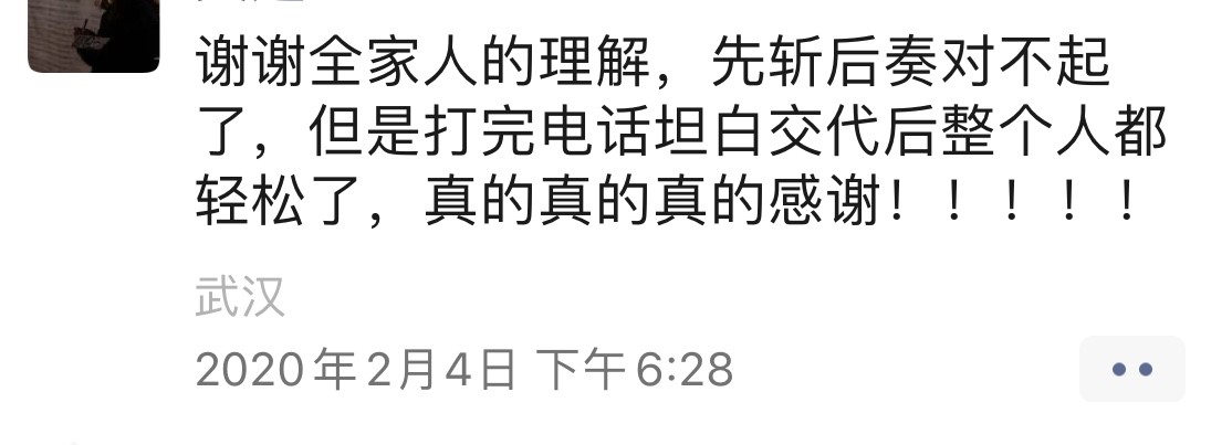 挂断电话,越越心里松了一口气,她打开朋友圈,定位到“武汉”,发了一条文字状态,向家人的理解表示感谢,也给自己接下来这场未知的战“疫”打气。