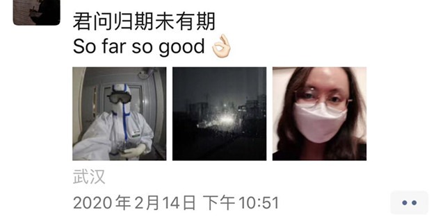 2月14日,越越又发了一条定位在“武汉”的朋友圈:“君问归期未有期,so far so good.”照片中戴着口罩的越越难以掩盖倦容,雨雪交加的武汉在黑夜中仍点亮着希望的明灯。