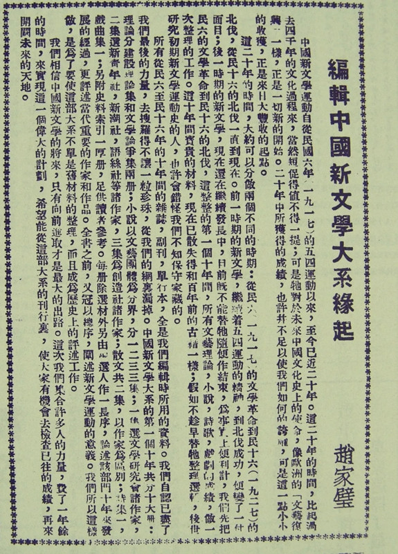 1935年3月15日刊行的《良友画报》第103期上,有《中国新文学大系》系列广告,其中包括赵家璧的《编辑中国新文学大系缘起》:“我们相信中国新文学的将来,只有向前进取才是最大的出路。这次我们集合许多人的力量,费了一年余的时间,来实现这一个伟大的计划,希望能从这部大系的刊行里,使大家有机会去检查已往的成绩,再来开辟未来的天地。”这“许多人的力量”,落实在赵家璧所撰《 <中国新文学大系> 前言》,便是: 中国新文学大系>