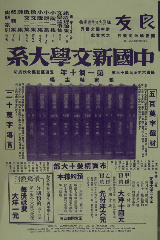《中国新文学大系》的畅销,除了编者阵容足够强大,再就是宣传很到位。比起登载于大型月刊《文学》等的广告,在公司自家刊物《良友画报》上,关于《大系》的宣传更是铺天盖地。日后研究者论及时人对于《大系》的评价,多来自赵家璧《话说 <中国新文学大系> 》中引述的《大系样本》;而此《大系样本》的内容,大都见于《良友画报》第103—112期的广告。这里就以广告最为集中且最精彩的《良友画报》第103期(1935年3月15日)为例。 中国新文学大系>