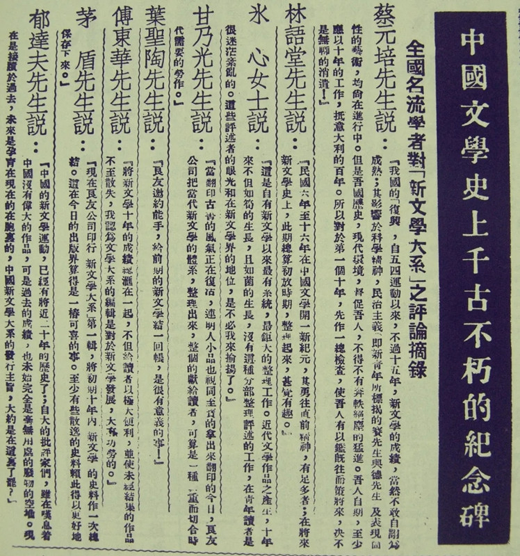 傅东华先生说:“将新文学十年的成绩总汇在一起,不但给读者以极大便利,并使未经结集的作品不至散失,我认为文学大系的编辑是对于新文学发展,大有功劳的。”