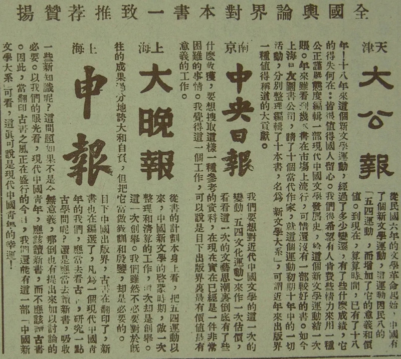 从《导论集》的角度,反观《大系》的制作与传播,未始不是一个有趣的角度。更何况,本文的撰写,主要针对新编《 <中国新文学大系> 导言集》的读者。 中国新文学大系>