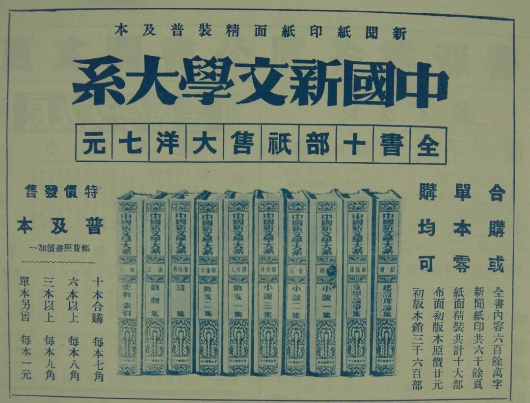 将《大系》的“导言”结集成书,这一绝佳创意,早就潜伏在这套大书的编选过程中,也符合主编的设想及出版社的利益。“文选”的主要功能,不外存文献、见眼光、定经典、传久远,可规定每集冠以两万字的“导言”,明显是“别有幽怀”。《大系》尚未面世,出版商已在《良友画报》第103期上大做广告,主打词为“五百万字选材,二十万字导言”;《大系》即将出齐,《文学》5卷4号又刊登“《中国新文学大系》十大部之内容说明”,着重介绍的依旧是各家的“导言”或“序文”[6]。“导言”成了《大系》的重要卖点,这正是日后《中国新文学大系导论集》得以单独成书的预兆。