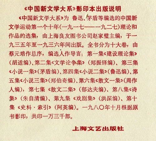 [5]1982年上海书店以“中国现代文学史参考资料”的名义出版《中国新文学大系导论集》,其影印说明称:“《中国新文学大系导论集》,是三十年代上海良友图书公司出版的十卷本《中国新文学大系》各卷导论的汇编。全书对我国‘五四’以后第一个十年间的新文学运动作了全面的总结。据上海良友图书公司1940年10月初版本影印。”