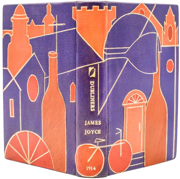 《都柏林人》(Dubliners),伦敦:Grant Richards Ltd.,1914年,初版一刷;印数一千两百五十册。一千两百五十册中,由Grant Richards书坊先行装订七百四十六册,于1914年6月15日在伦敦首发;其余五百零四册海运至纽约的B. W. Huebsch书坊,之后于1916年12月15日至1917年1月1日期间在美国出版。这一册是美国装帧家使用紫色哈麦丹山羊皮重新装帧的作品。乔伊斯一辈子酗酒,是个不折不扣的酒鬼。装帧元素包括硕大的酒瓶、自行车、屋舍入口处、都柏林教堂,以彩色镶皮书封诠释日常生活中的乔伊斯及其与天主教内心冲突的现实。《都柏林人》是乔伊斯早期短篇小说集,从封笔到出版等待了九年。此集中弥漫着的“怪异恐怖的柔情”伴随了他颠沛的一生。多年的衰败与经济的停滞不前,令二十世纪初的都柏林“瘫痪”为一座生活艰辛、深陷绝望的城市。诗人叶芝等发起爱尔兰文学复兴运动,期望通过新的艺术作品恢复爱尔兰民俗,以此促进民族认同。乔伊斯有意回避这一如火如荼的运动,认为这一运动过于心胸狭窄、粗野偏狭、自我封闭。他坚信“文学的真理”不在于借助往昔经过美化了的镜头来审视爱尔兰,而是应该像他在《都柏林人》中所做的那样,以“现实的”和“无所畏惧的严苛”来审视现代爱尔兰经验。他试图通过他“精心擦拭的镜片”,让陷于“精神/道德瘫痪”的同胞好好看看他们自己的真实——“我们愚蠢、滑稽、呆滞、腐败,但我们仍值得同情”。乔伊斯真正的企图乃是,借助于《都柏林人》,再次唤醒“爱尔兰良知”,从而为“我的国家带来精神上的解放”。