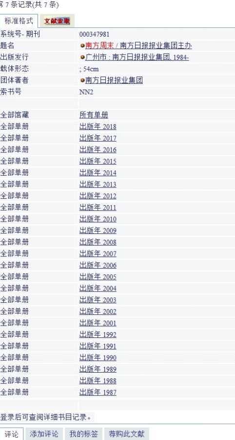 一旦我们想要进入图书馆查检原报,就必须通过查询图书馆在线“机读目录”、确认其是否已纳入馆藏这一程序。但是,正如我们所知,在图书馆“机读目录”中,一份报纸无论发行时间多长、总数有多少张、合订本有多少册,一般可能只有一个条目。在这一条目之下,除题目、著者等一般著录的字段,也还罗列有馆方依其发行年限或其他标准加工而成的各个合订本的所谓“详细书目记录”,但很明显,这仍然无法深入我们所需要的具体的某篇文献。试想,假如没有之前获得的具体的发表时间等等信息,如何查找这篇专访资料?无异于大海捞针。然而,这一切,恰是专门的目录、索引可以派上用场的地方。不仅如此,正如北京大学中古史研究中心的史睿兄评论拙文时所指出的:“产生于计算机信息处理技术发展初期的机读目录,早已远远落后于当今信息处理技术发展水平,就知识体系而言不及纸本目录,就直指关键词检索而言不及纸本索引等检索工具书。”而且“目前图书馆的机读目录表面上便于检索,因其完全无序(书目内在意义的顺序),其实是取消了传统目录‘即类求书’功能,更不要说用以‘辨章学术、考镜源流’了。”