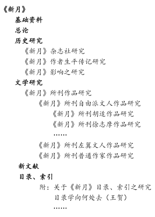 不过,为了讨论的方便,这里仍不妨举一个与《新月》杂志有关的资料(包含专书、报刊文献等等)编目的例子。但首先必须声明的是,这个目录只是我自己一时所拟,只是一方便法门,实际情形一定要较此复杂得多,当然也需要被不断地进行完善、修改: