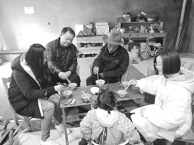 秦岭(左二)和心理志愿者在藏族群众家中采访