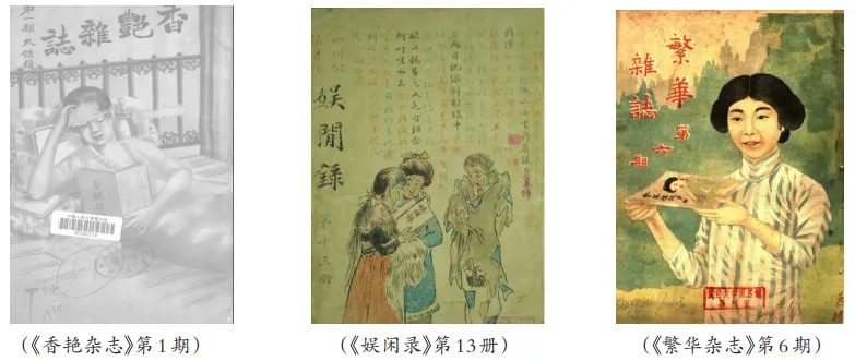 可以看到,从1914年至1915年,在《小说新报》《中华小说界》《礼拜六》《香艳杂志》《娱闲录》《繁华杂志》等小说杂志(或主要刊登小说作品)的封面上,都出现了一个性别化了的小说读者,为我们连缀出了一幅民国初年女性小说阅读网络、接受网络和传播网络的全景图画。在前四幅封面上,阅读的女性独自出现在窗下、桌前、床边等私人领域,“她们”眼帘朝下,嘴角微微上扬,手中捧着正在津津有味阅读的,正是该杂志本身。在后两幅图画中,女性成群出现在林荫与户外等公共领域:《娱闲录》上的三位女性年龄各异,正聚集在一处讨论着什么;而《繁华杂志》上这位手捧杂志的女子,正在将该刊递向他人。图片上隐去的这位“对面人”,是她的爱人、闺友还是其他什么人呢?这为读者留下了丰富的想象空间。杂志的封面常常被看作是一个刊物的形象代言人,“女性读者”的出现,构成了“女性”与“小说”关系的两种隐喻:一方面,这些读书女性的倩影被绘制成封面图画,通过购买和阅读,走向一个更加广阔的公共空间;另一方面,它也将隐含在阅读空间中的女性读者物品化、风景化、公共化,进而与杂志的商品属性实现某种“同构”。从这样一个角度来讲,“女性”与“小说”堪称一而二、二而一,共同打造了一个都市商品文学的风景线。
