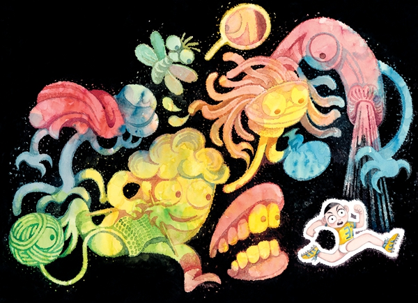 澎湃新闻:这本书里您画了大量“睡魔怪”的形象,每次出现几乎都不重复,我觉得比较有意思的是,除了虫子、雷电这种孩子在生活中比较容易害怕的东西,还有大量像牙膏、花洒、哨子、马桶、闹钟这些看似无害的日用品,有一幅画面里还出现了奶奶笑呵呵织着毛线的形象。为什么会这样设计呢?您有参考过类似儿童心理学之类的专业材料还是更多地从个人经验或是孩子的讲述中取材?