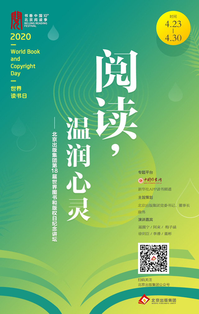 2020年“世界图书和版权日”,北京出版集团推出“阅读,温润心灵——北京出版集团第18届世界图书和版权日纪念讲坛”,以阅读的方式,在文化与科技高度融合发展的5G时代中,履行出版企业的文化使命和责任担当,广邀名家学者相约线上阅读分享,共品书香,共话人生。希望书香里的安静笃定能传递给人们温暖与力量,驱散阴霾、烛照人心。