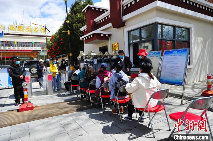 4月23日,位于西藏拉萨市的西藏自治区图书馆实行动态限流措施,工作人员为等候进馆的读者提供座椅,并现场组织抽奖活动。 张伟 摄