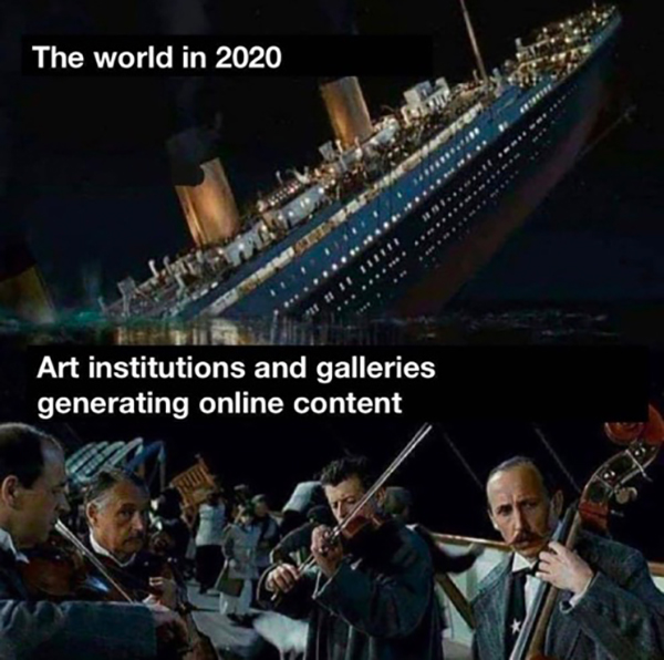 新冠病毒以指数级规模和速度穿越物理边界的同时,它的次生灾难也刺激了社会各界的末日想象。最近在社交媒体上流传的一个表情包来自《泰坦尼克号》的两个场景:下沉中的邮轮象征着“2020年的世界”,甲板上演奏的乐队则代表着“生产线上内容的艺术机构和画廊”。这个表情包给艺术界敲了一记闷钟:世界之舟正在沉没,全球经济前景岌岌可危,艺术工作者的安全网和社会身份难以独善其身,难道继续生产仅仅是为了维系一种归属感?艺术工作者会不会成为这些内容的唯一观众?