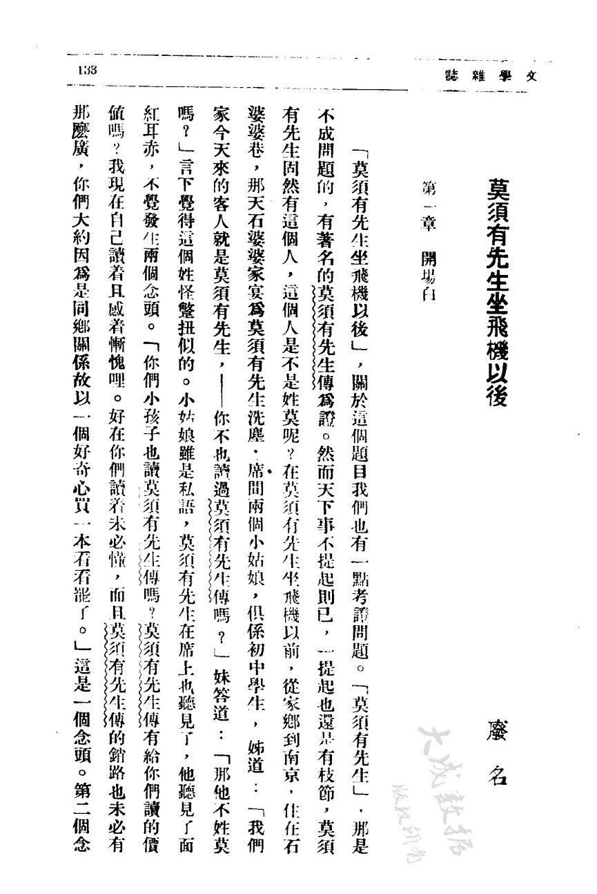 《莫须有先生坐飞机以后》“开场白” 初刊《文学杂志》1947年6月第2卷第1期