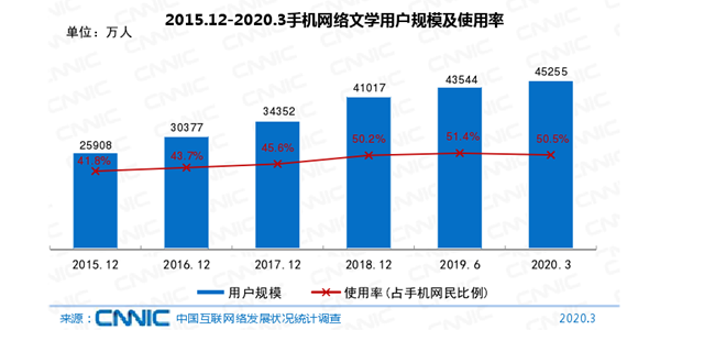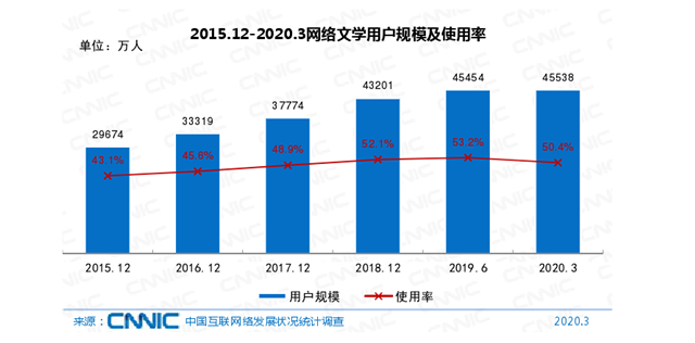 截至2020年3月,我国网络文学用户规模达4.55亿,较2018年底增长2337万,占网民整体整体的50.4%;手机网络文学用户规模达4.53亿,较2018年底增长4238万,占手机网民的50.5%。