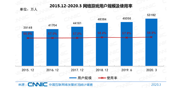 截至2020年3月,我国网络游戏用户规模达5.32亿,较2018年底增长4798万,占网民整体的58.9%; 手机网络游戏用户规模达5.29亿,较2018年底增长7014万,占手机网民的59.0%。