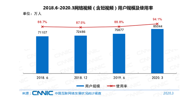 2018.6-2020.3网络视频(含短视频)用户规模及使用率