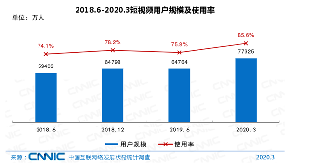 截至2020年3月,我国网络视频(含短视频)用户规模达8.50亿,较2018年底增长1.26亿,占网民整体的94.1%。其中短视频用户规模为7.73亿,较2018年底增长1.25亿,占网民整体的85.6%。2020年初,受新冠肺炎疫情影响,网络视频应用的用户规模、使用时长均有较大幅度提升。