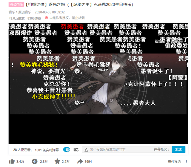 此外,粉丝还为主角克莱恩庆生制作了同人歌曲,该作品在B站获得43万点击、8000多条弹幕评论。B站内《诡秘之主》的粉丝自制相关视频数量高达1000多个,专栏数量有140余个。