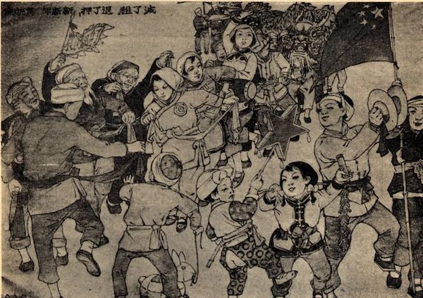 在1949年以来的美术创作中,有很多以儿童为题材的美术作品,其中有很多人们熟悉的儿童游戏。这些不同形式的画曾经在民间有着广泛的影响,并与社会政治和社会发展紧密关联,反映了这一时期儿童题材美术创作的特点。其中以“娃娃戏”的形式来表现的儿童的生活,延续了延安以来的传统。1947年,冯真在延安的“大众美术社”创作了《娃娃戏》《参军》,在当时的印刷量就高达60万份。诞生于革命根据地的《娃娃戏》,不是传统“娃娃戏”中多子多福的寓意,而是有着鲜明的政治主题,是革命机器中的齿轮和螺丝钉。而这种表现儿童模仿戏剧(皮影戏或傀儡戏)的场景,曾经是革命根据地生活中常见的景象,反映了新文化民众宣传的潮流。这种好人与坏人的装扮表演,又类同于当时流行的街头“活报剧”。1950年,张仃创作的《新中国的儿童》,以新中国儿童装扮成海陆空军以及工农的形象,表现了新中国儿童在新社会的政治态度和立场,是这一时期最典型、最有影响的代表作,是延安传统在新中国的发展。