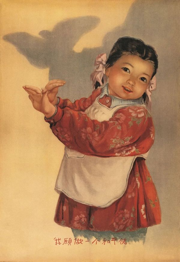 方菁的《我愿做一个和平鸽》(1961年),是当时深受欢迎的一幅年画。画面中的小女孩用双手通过灯的投影而成和平鸽的影像,也是表现时代主题的一种方式。50年代初抗美援朝时期的和平签名运动,以及朝鲜战争结束之后人们对于和平生活的期盼,都是这一时期美术创作的重要主题。这一通过光影的游戏,还可以投影出其它动物,是一种益智游戏。只不过通过游戏而反映的时代主题,摄取了人们生活中的日常,而绘画又像教科书那样指导其他孩子去模仿,去创造。