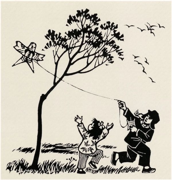 放风筝是孩子们最喜欢的放飞心情和理想的游戏。李桦的《春日》(1961年)所表现的放风筝的孩子,其优美的动态与飞翔的风筝和飞鸟所构成的动势,是李桦在新中国完善版画转型的具体努力。这类表面上没有政治主题的儿童生活的表现,实际上还是表现出了新中国美术创作所要求的反映新时代的需求。