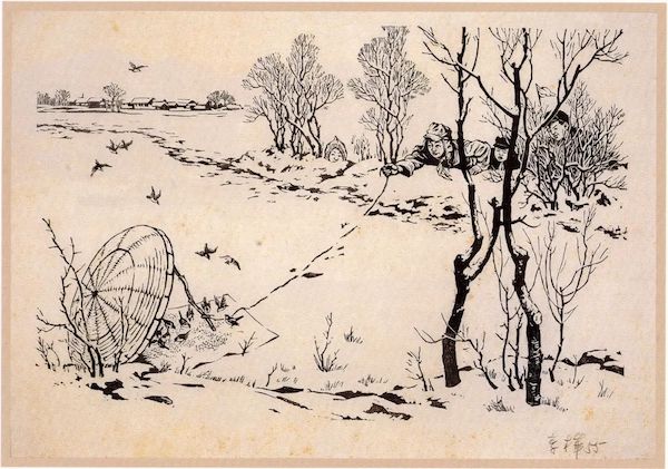 50年代有一段时期的“除四害”,其中的打麻雀是因为麻雀和人争食,而当时的饥饿与粮食问题,是新中国立基的重要问题。以食为天的打麻雀有多种方式,而作为游戏的弹弓则是少数儿童能够掌握的一项技能。魏紫熙1956年创作的《神射手》像肖像画一样,表现了儿童玩弹弓的形象,所不同的是这里不 是一般意义上的“玩”,而是关联着打麻雀的社会政治背景。丰子恺的《香稻》是另一种形式的捉麻雀,画面中的儿童在窗外撒上了一些稻谷,上面支上了竹筐,支竹筐的杆子上系了绳子,并连接到窗内。儿童探出头来窥视,只待麻雀走进筐内就拉掉杆子,活捉麻雀。相同题材的还有李桦1955年的木刻《抓麻雀》;而在1956年的国画中还有钱松喦《捕雀》,唐云《捕雀图》,赵延年、唐云的《捕雀图》等。尽管这种与动物的关系发生在过去的那个时代,可是,儿童对于动物的兴趣也是那个时期的平常。这种活捉麻雀的方式一般都在冬季,因为这个时候的麻雀觅食困难。依然是在冬天,丰子恺的《瑞雪映睛空儿童塑雪翁》(1961 年)表现的是雪后儿童堆雪人的场景,而萧淑芳笔下的儿童滚雪球,也是在冬天雪后常见的儿童游戏。不管是滚雪球,还是堆雪人,直到今天都是儿童们的最爱。