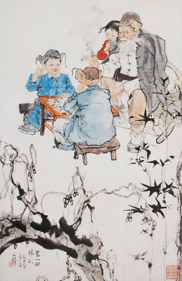 像滚雪球和堆雪人一样,下棋也是一直延续至今的一种儿童的游戏方式,而且是一种能够持续一生的游乐方式。程十发于1958年创作的《第一回胜利》,表现了两位下象棋的男孩,他们中的一位取得了第一次胜利,旁边观战的爷爷以及他们的姐姐(妹妹)都露出了笑容。