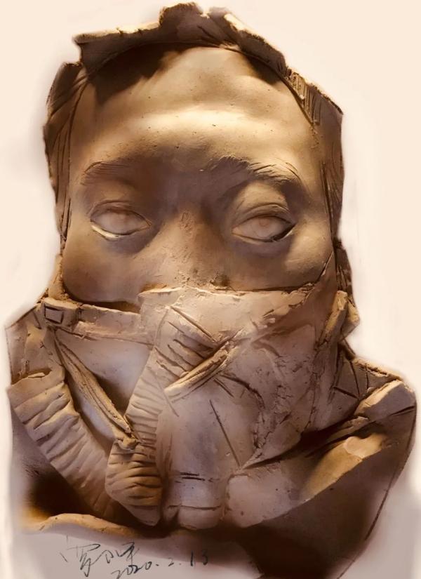 参展的罗小平的疫期雕塑《隔离期手记》,是把疫情期间每天发生的社会时事新闻,融入自己的创作当中,表现各类人物的精神世界,表情极为丰富,有的是关于苦难、惶恐、挣扎;有的是关于无助、求援和勇敢;有的是善良、奉献和牺牲,丰富多元,其中一则《隔离期手记》是记武汉一位九十岁老母亲,为了家庭其他成员不被患上新冠肺炎的六十四岁的儿子感染,自己冒险独自照顾儿子五天五夜,直到把儿子送进隔离病房,还书写一封永远无法送达的信,“儿子,要挺住!……”