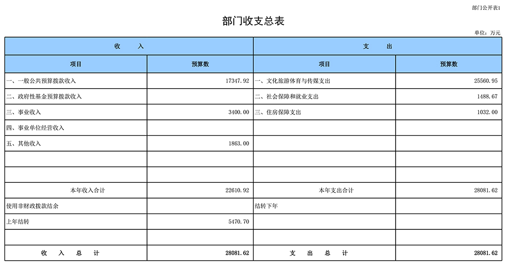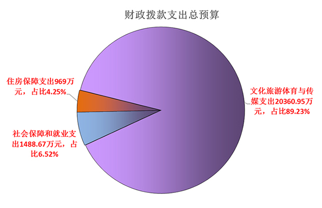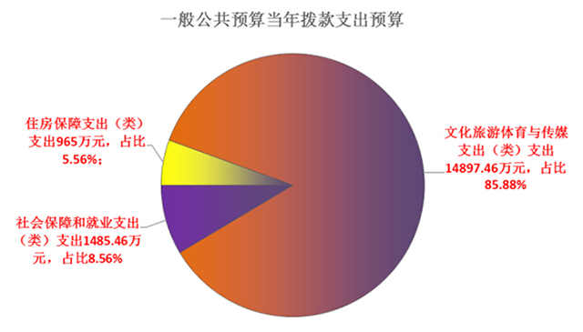 文化旅游体育与传媒支出(类)支出14897.46万元,占比85.88%;社会保障和就业支出(类)支出1485.46万元,占比8.56%;住房保障支出(类)支出965.00万元,占比5.56%。