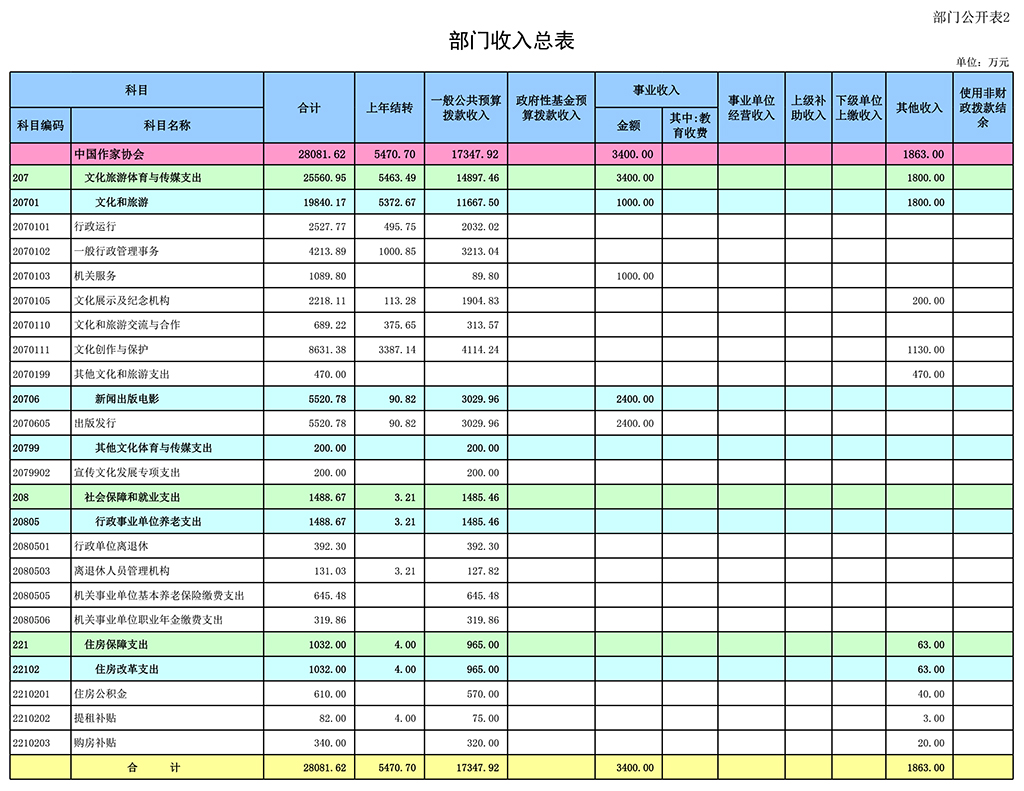 按照综合预算的原则,中国作家协会所有收入和支出均纳入部门预算管理。收入包括:一般公共预算拨款收入、事业收入、事业单位经营收入、其他收入、上年结转。支出包括:文化旅游体育与传媒支出、社会保障和就业支出、住房保障支出。