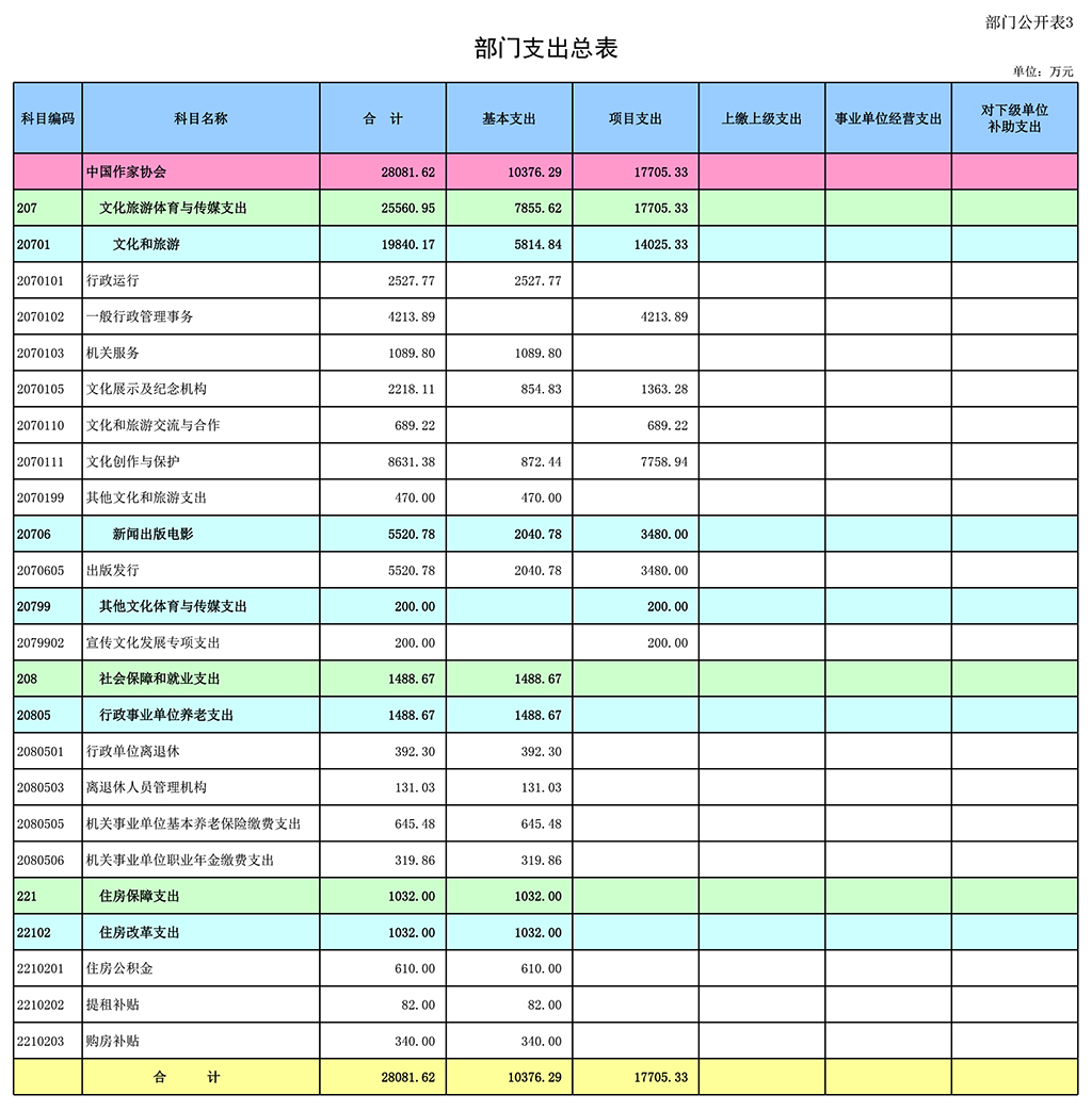 (十二)文化旅游体育与传媒支出(类)新闻出版电影(款)出版发行(项):主要指中国作协所属报刊社网出版传播的项目支出。